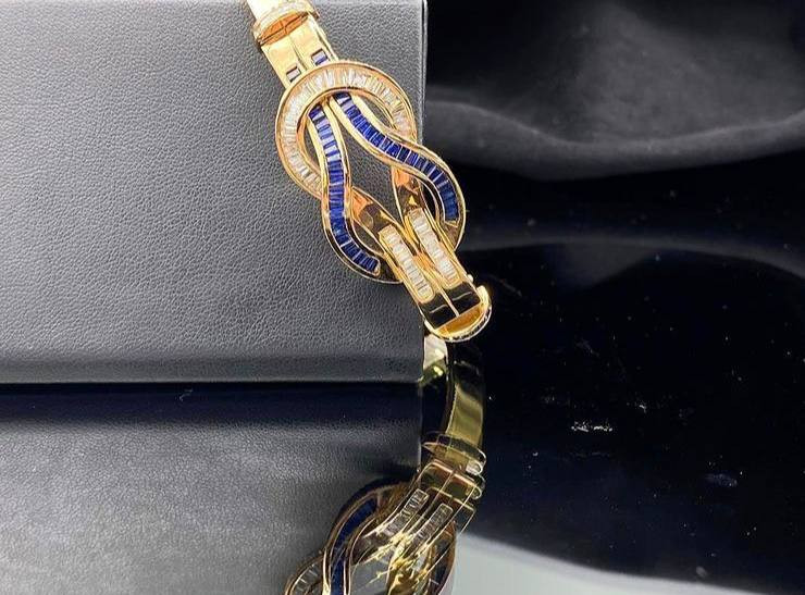 سنگ هاي درخشان و ظریف و مقاوم با ظرافت بالا روی بدنه طلای ۱۸ عیار کار شدهاند و جلوهای درخشان و چشمنواز به این بنگل میبخشند. از آنجا که ۱۰۰٪ وزن سنگ كسر میشود، ارزش طلای خالص کار حفظ شده و خریدی اقتصادی و هوشمندانه خواهید داشت.
